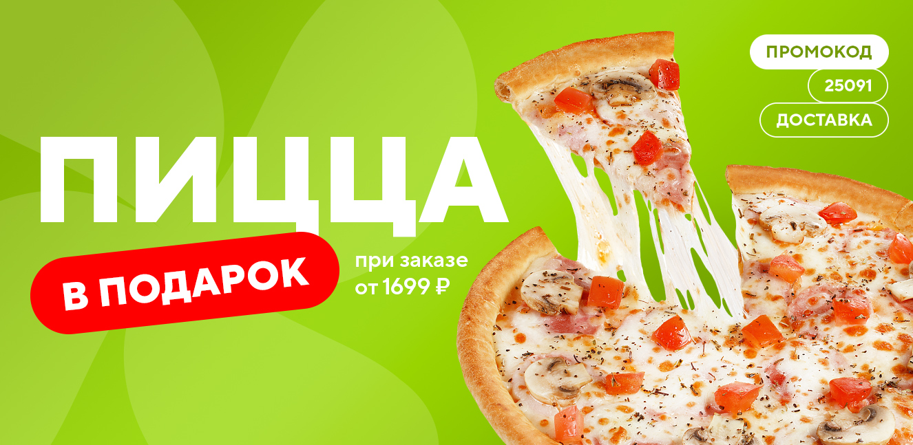 Для участия в Акции совершите единовременный заказ с доставкой на сумму от 1699 рублей, до оформления заказа введите в корзине или назовите оператору промокод 25091 и получите в подарок среднюю пиццу на выбор из списка: «Деревенская», «Итальянцы в России», «Маргарита», «Мясное плато», «Пепперони ЧИЗ», «С курочкой и ветчиной», «Сырная», «Овощной микс», «Французская», «Чесночный цыпа».