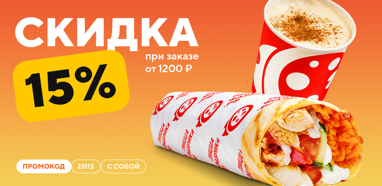 Предлагаемая скидка: 15% на заказы с собой от 1200 рублей при вводе промокода 25113.