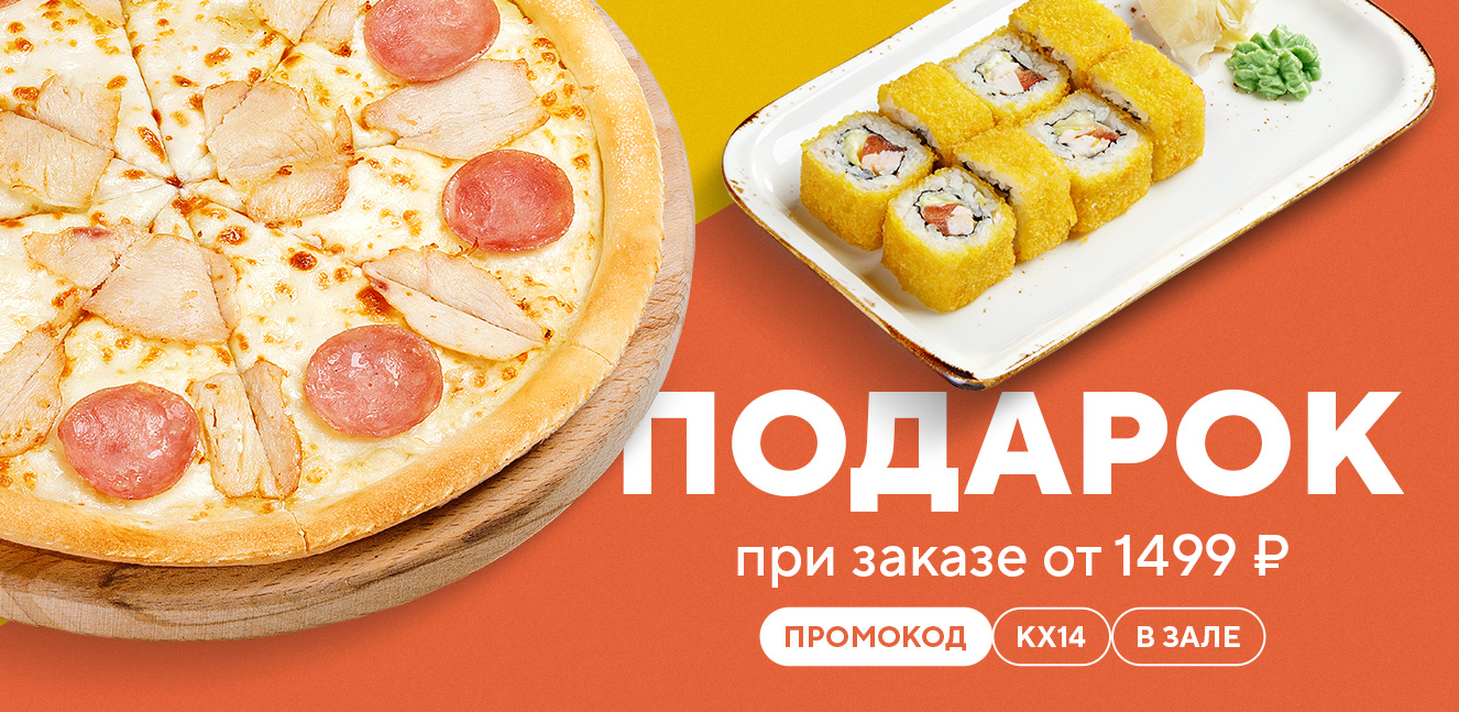 Дарим пиццу или роллы при заказе в зале от 1499 рублей!