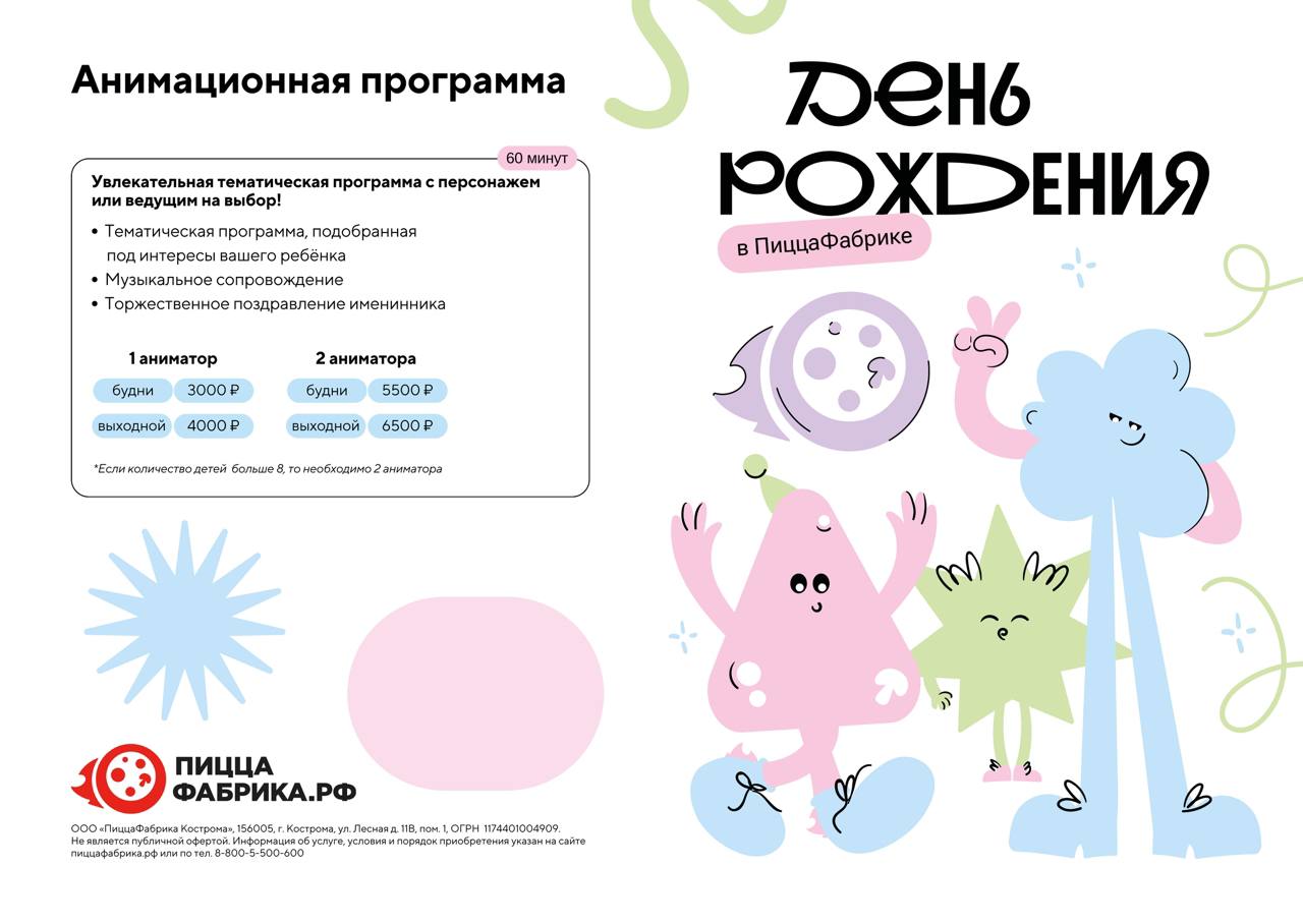 Чтобы ребенок запомнил этот день. Чтобы вам не нужно было ничего самостоятельно организовывать и думать, чем занять гостей. Чтобы самое большее, о чем пришлось бы беспокоится, это - что заказать по меню. Для всего этого мы и придумали программу Дня рождения под ключ! Мы учли опыт проведенных праздников, отобрали лучших аниматоров, отсмотрели все программы и собрали вместе самое лучшее. Вам осталось только написать нам в сообщество VK ПиццаФабрика Кострома и назначить дату.