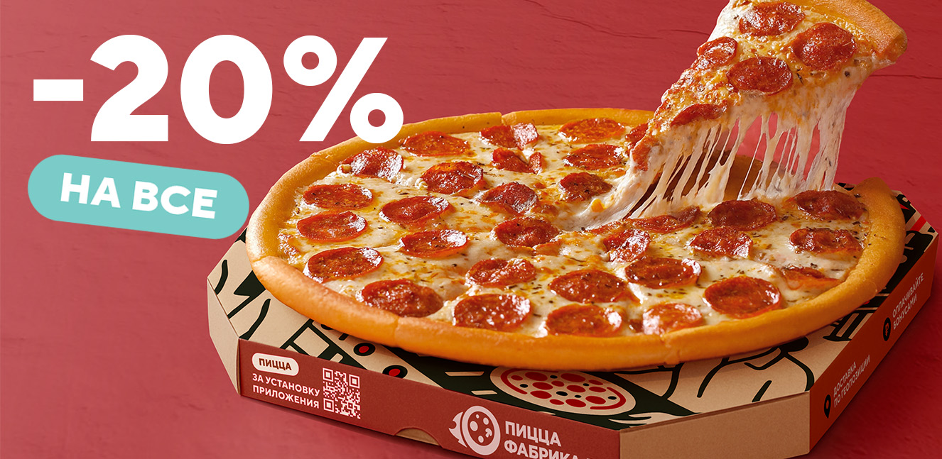 В период с 18 октябя 2025 года по 31 декабря 2025 года совершите единовременный заказ в цифровой пиццерии “ПиццаФабрика”, до оформления заказа введите промокод и получите скидку 20% на всё меню
