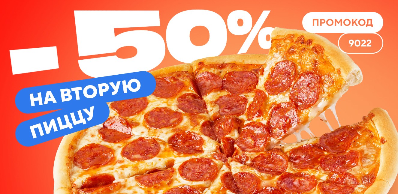 Введите в корзине или назовите официанту / оператору до оформления заказа промокод 9022 – стоимость второй пиццы из списка снизится на 50%.