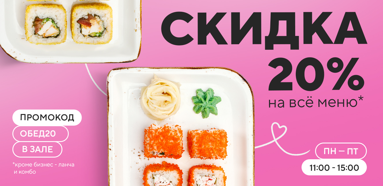 Сообщите оператору или введите в корзине до оформления заказа промокод ОБЕД20 и получите скидку 20% на всё. В Акции не участвуют комбо и бизнес-ланчи.