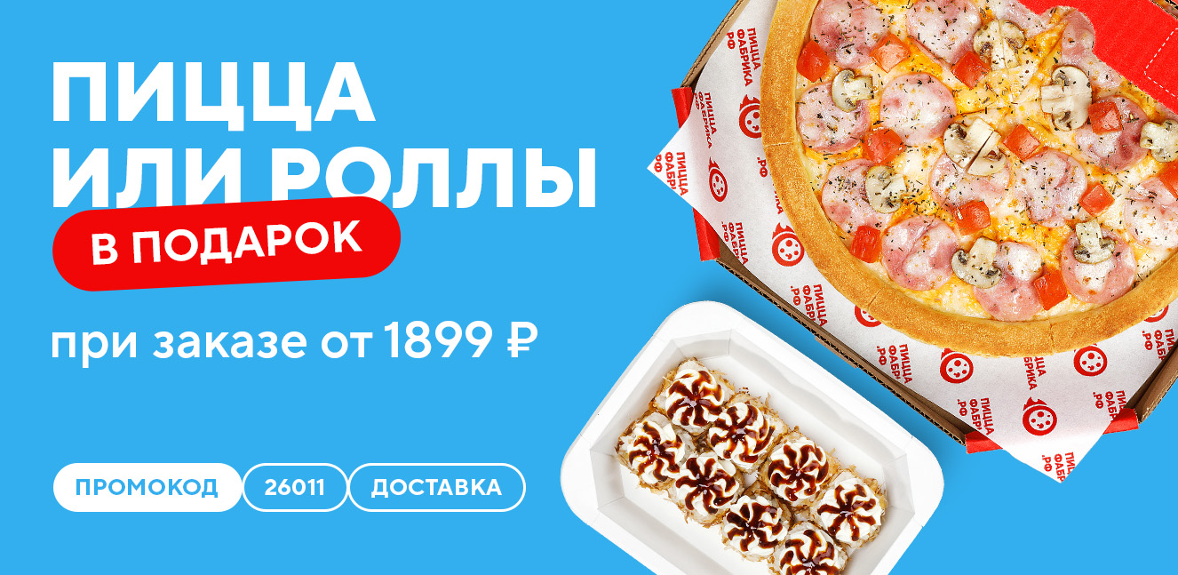 В период проведения Акции оформите единовременный заказ с доставкой от 1899 ₽, добавив в него 1 среднюю пиццу из списка: «Четыре сыра», «Итальянцы в России», «Маргарита», «Пепперони ЧИЗ», «Пепперони», «Сырная», «Овощной микс», «С курочкой и ветчиной», «По-домашнему» или 1 порцию роллов из списка: «Калифорния», «Цезарь», «Бамбито», «Чикен Терияки», «Ямато».