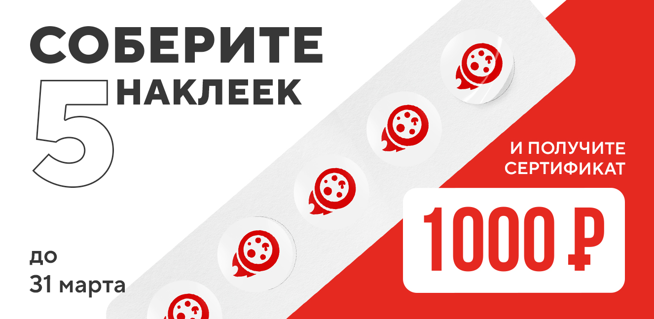 Соберите 5 наклеек и получите сертификат на 1000 рублей, который можно использовать на заказ в ресторане, «с собой» или на доставку в любой день недели.