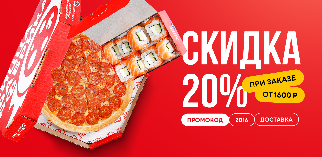 Для участия в акции совершите единовременный заказ с доставкой от 1600 рублей, введите в корзине или назовите оператору до оформления заказа промокод 2016 и получите скидку 20% на весь заказ.