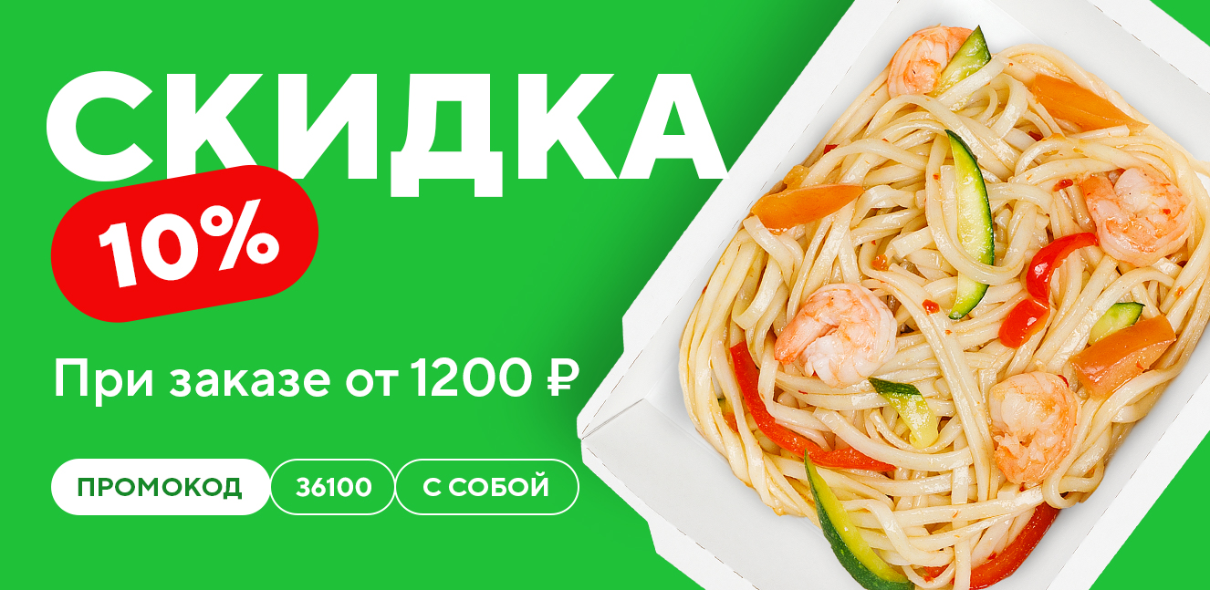Предлагаемая скидка: 10% на заказы с собой от 1200 рублей при вводе промокода 36100.