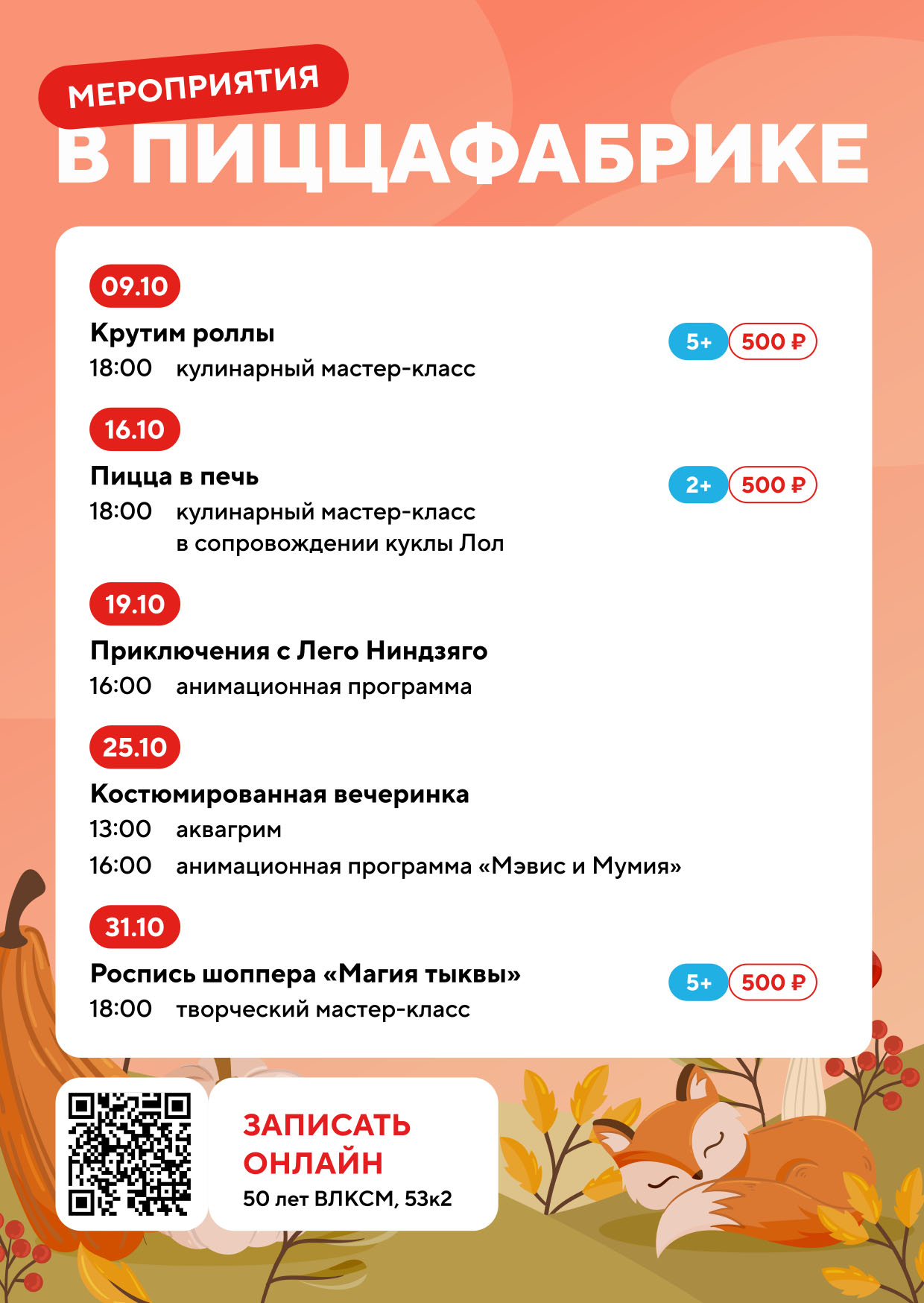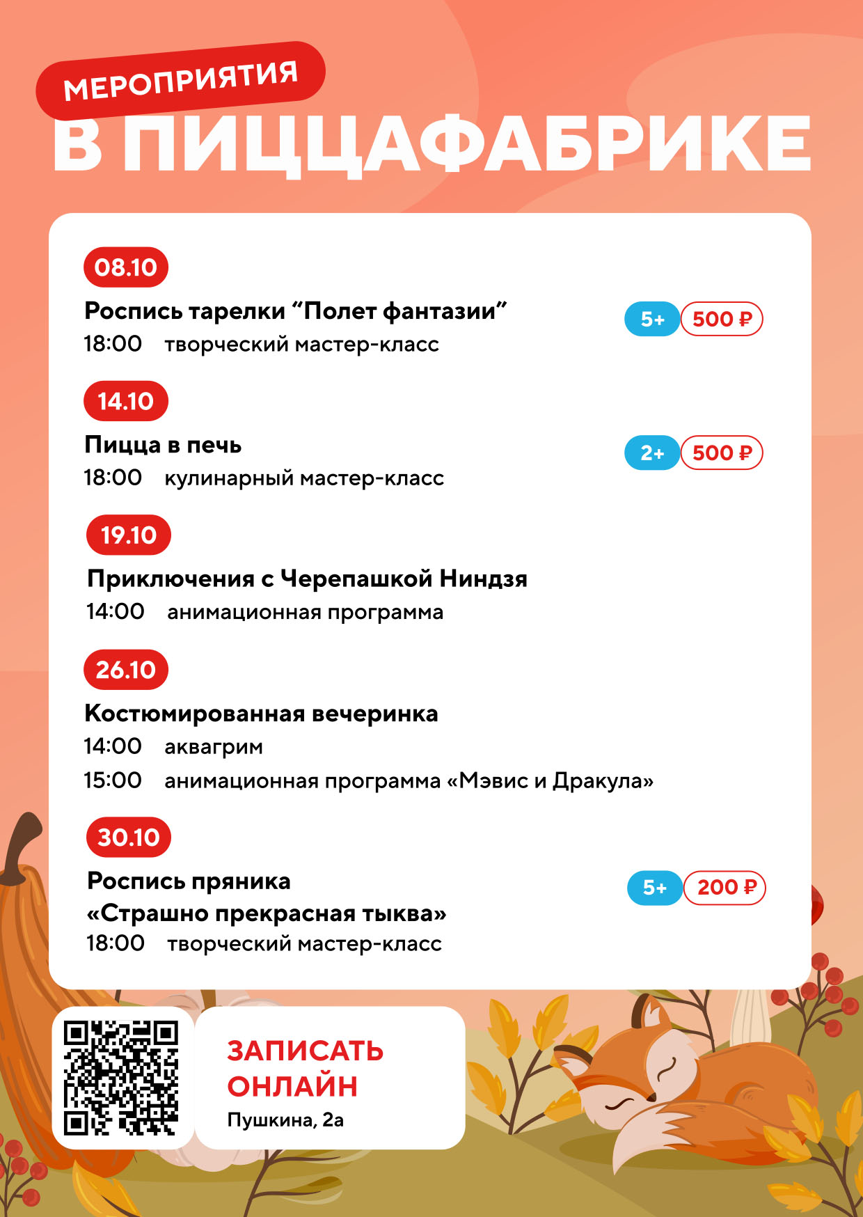 Пока ты маленький - пусть каждый день будет праздник! Мы топим за то, что устраивать классные события нужно без повода, поэтому в выходные в ПиццаФабрике всегда происходит что-то интересное: аниматоры, аквагрим и многое-многое другое. А на неделе есть мастер-классы - кулинарные и творческие! - чтобы и будни были раскрашены в яркие цвета! Следите за афишей, находите что-то свое и обязательно будьте с нами!