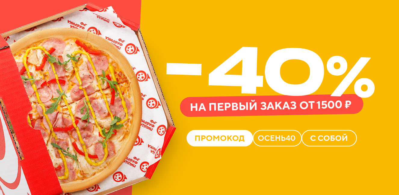 Для участия в акции оформите первый единовременный заказ на самовынос, до оформления заказа введите в корзине или назовите оператору/кассиру промокод ОСЕНЬ40 и получите скидку 40% при минимальной сумме заказа от 1500 рублей.
