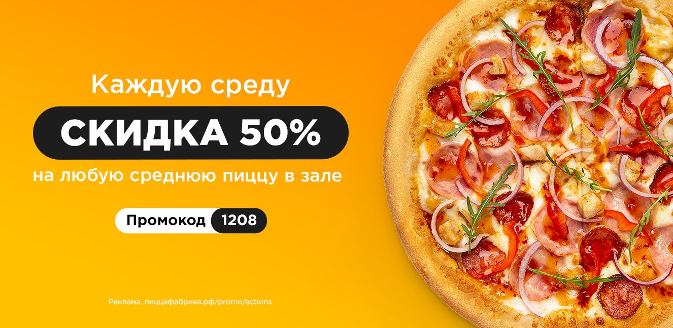 - Предлагаемая скидка: скидка 50% на любую среднюю пиццу на классическом тесте, кроме пицц “Баварская”, “Золотая рыбка”, “Барбекю”, а также пицц со знаком “Новинка.”