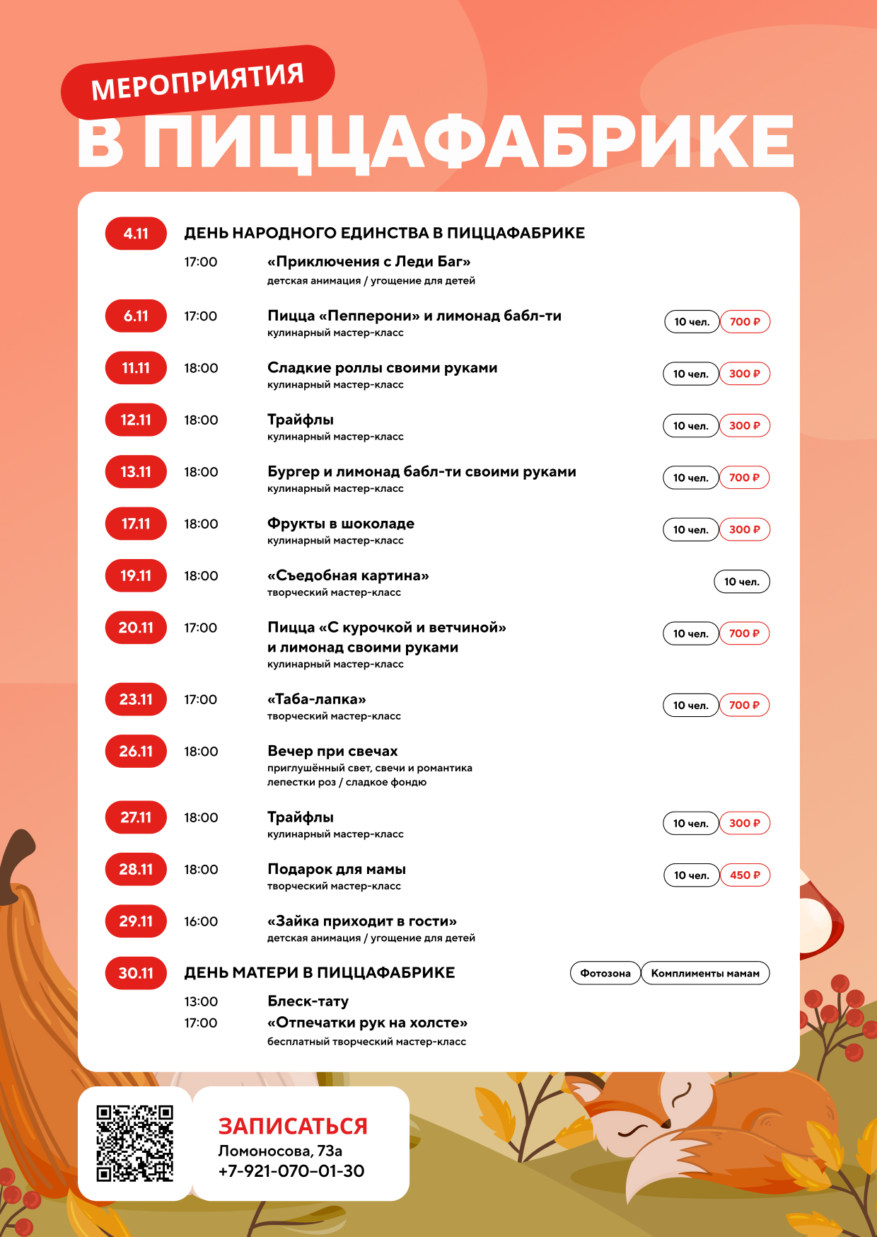Пока ты маленький - пусть каждый день будет праздник! Мы топим за то, что устраивать классные события нужно без повода, поэтому в выходные в ПиццаФабрике всегда происходит что-то интересное: аниматоры, сладкая вата для юных гостей, аквагрим и многое-многое другое. А на неделе есть мастер-классы - кулинарные и творческие! - чтобы и будни были раскрашены в яркие цвета! Следите за афишей, находите что-то свое и обязательно будьте с нами!