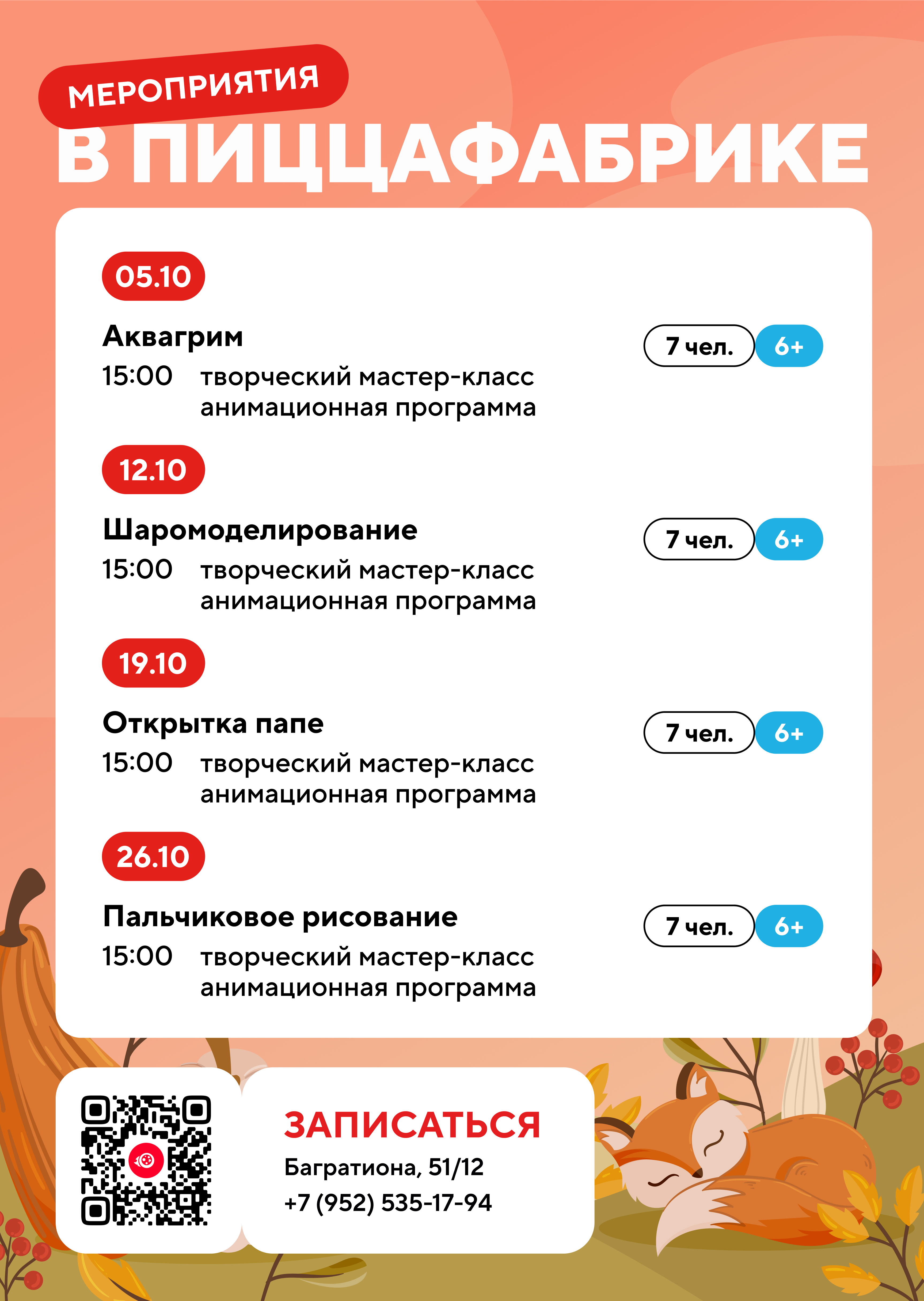 Пока ты маленький - пусть каждый день будет праздник! Мы топим за то, что устраивать классные события нужно без повода, поэтому в выходные в ПиццаФабрике всегда происходит что-то интересное: аниматоры, сладкая вата для юных гостей, аквагрим и многое-многое другое. А на неделе есть мастер-классы - кулинарные и творческие! - чтобы и будни были раскрашены в яркие цвета! Следите за афишей, находите что-то свое и обязательно будьте с нами!