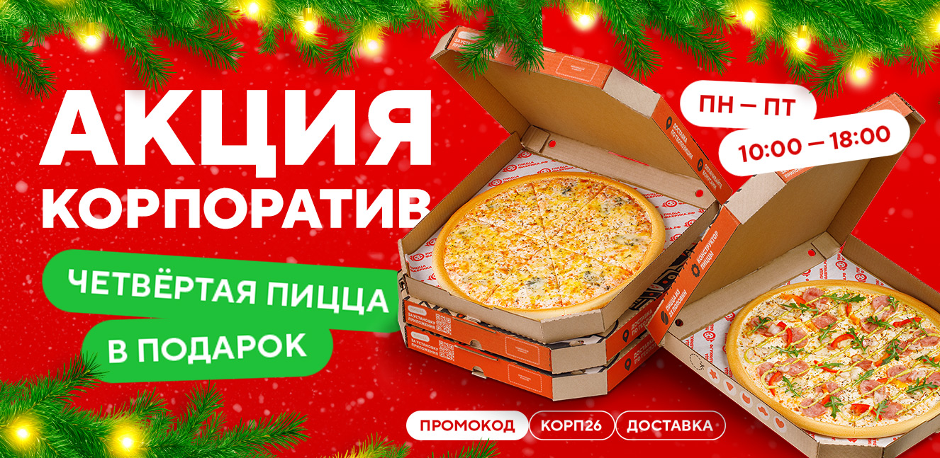 Для участия в Акции совершите единовременный заказ с доставкой или с собой, добавив в него три большие пиццы (кроме пиццы «Сырные палочки» и комбо «Три средние пиццы», «Три большие пиццы»). До оформления заказа введите промокод КОРП26 и выберите четвёртую большую пиццу в подарок.