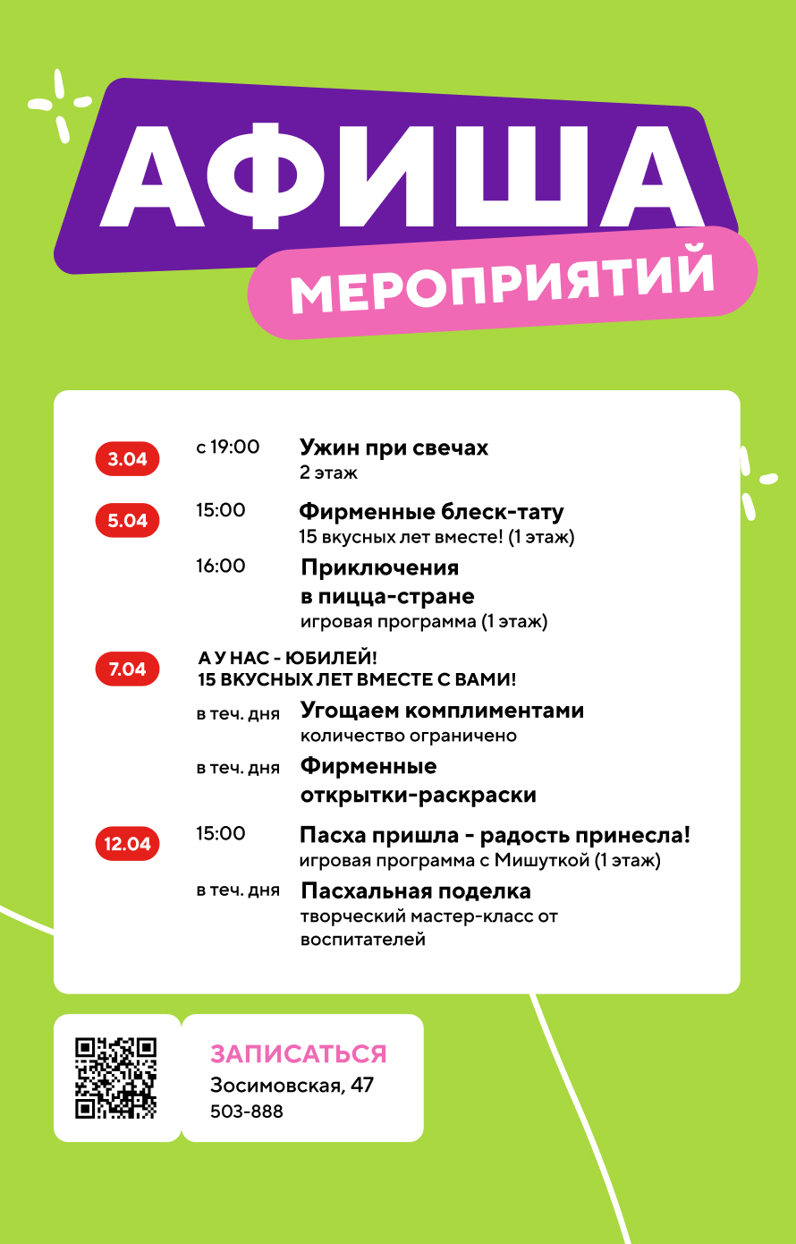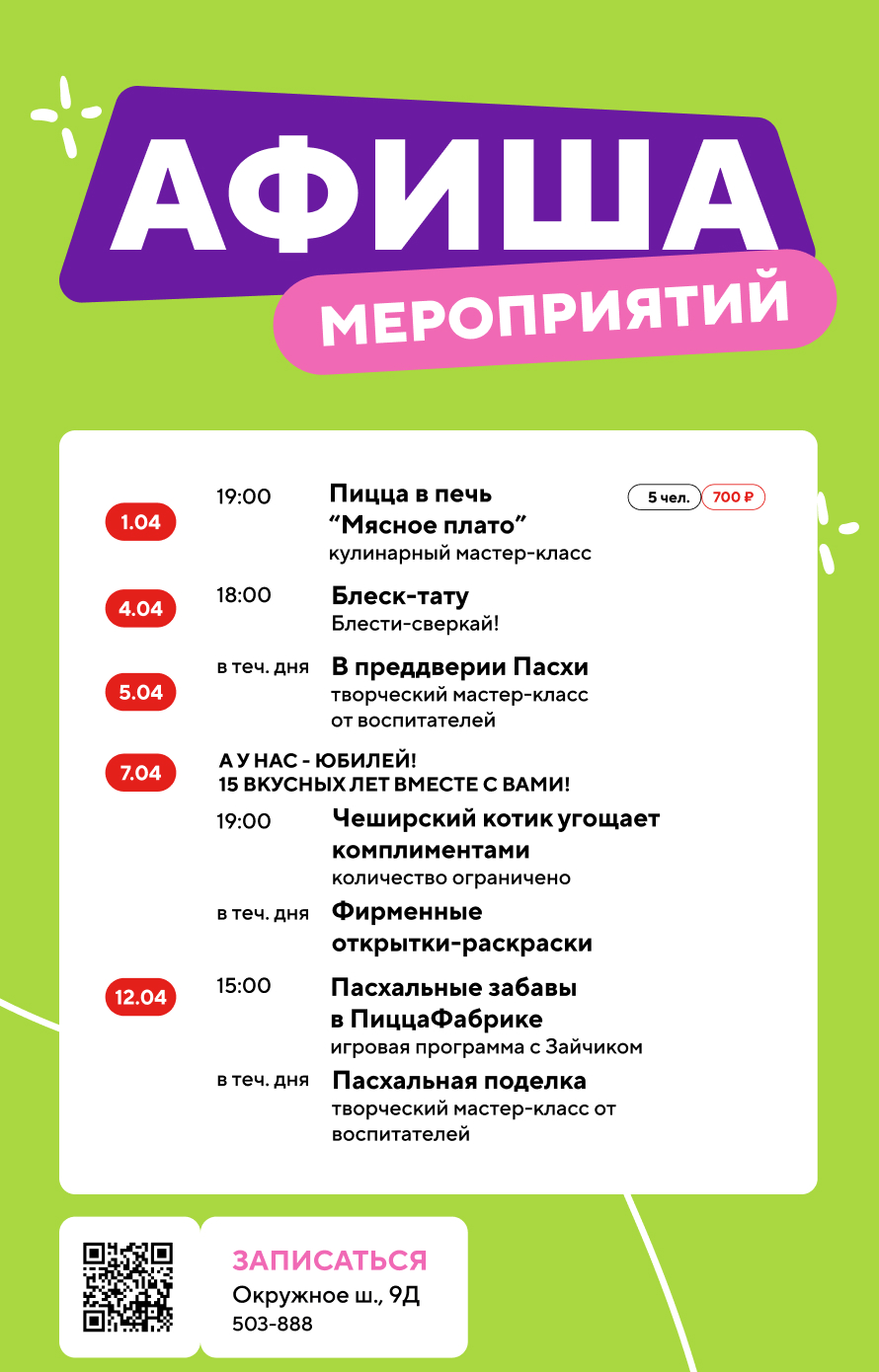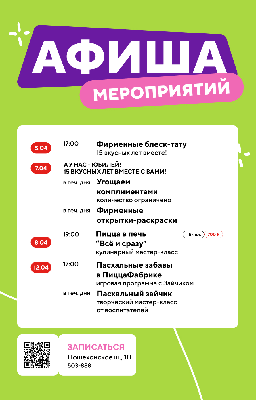 В ПиццаФабрике каждый найдёт что‑то по душе: детям — анимационные программы с любимыми героями, взрослым — увлекательные мастер‑классы и встречи с интересными людьми.