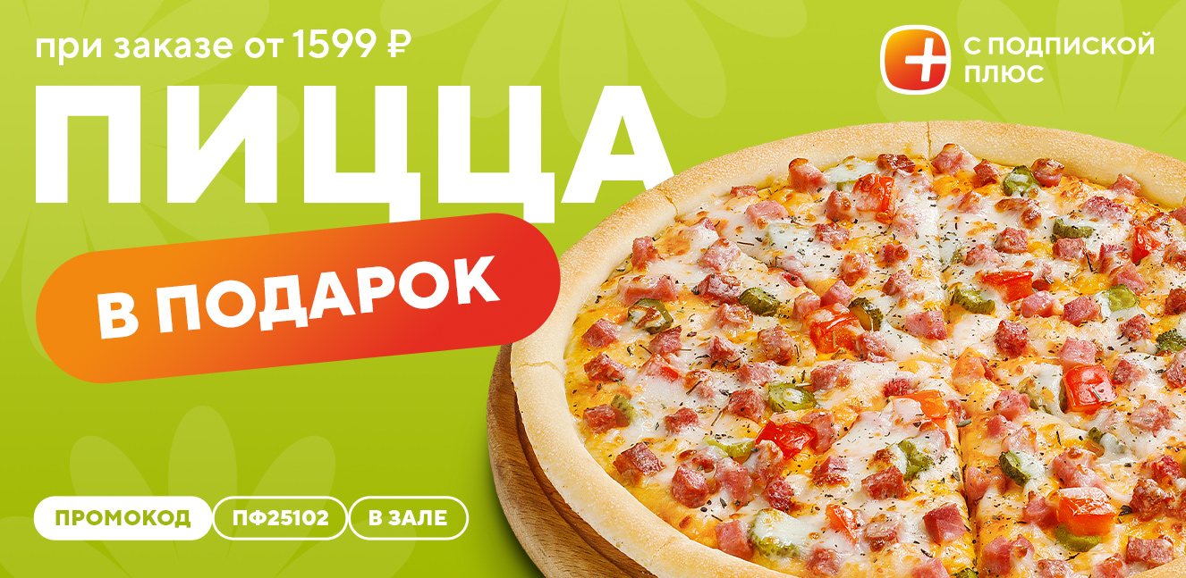 Для участия в Акции оформите единовременный заказ в зале через приложение на сумму от 1599 рублей, самостоятельно введите в корзине промокод ПФ25102 и получите в подарок среднюю пиццу на выбор: «Деревенская», «По-домашнему», «Сырные палочки».