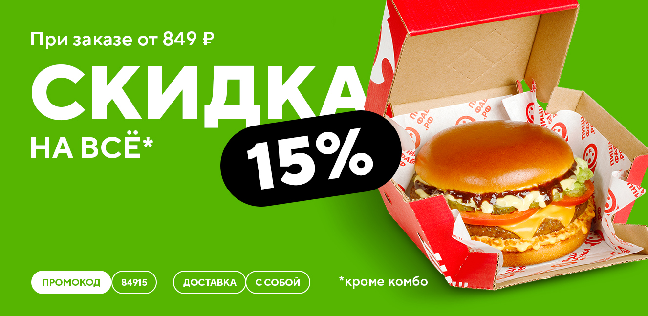 Для участия в Акции оформите единовременный заказ доставки или «с собой» на сумму от 849 рублей, до оформления заказа введите в корзине или назовите оператору промокод 84915 и получите скидку 15% на весь заказ.